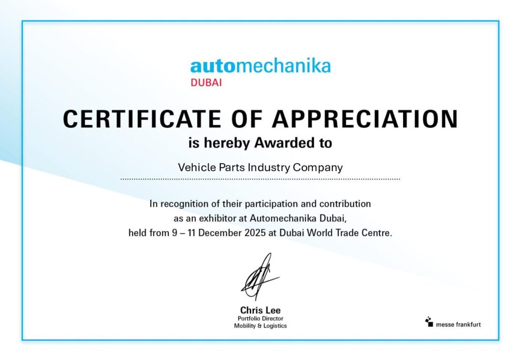 AUTOMECHANIKA DUBAI CERTIFICATE OF APPRECIATION In recognition of their participation and contribution as an exhibitor at Automechanika Dubai, held from 9 – 11 December 2025 at Dubai World Trade Centre.