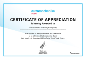 CERTIFICATE OF APPRECIATION In recognition of their participation and contribution as an exhibitor at Automechanika Dubai,